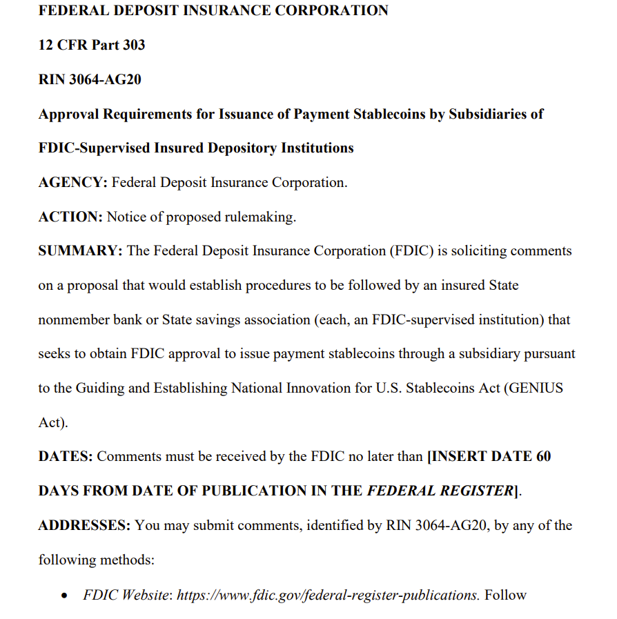 This week, the Federal Deposit Insurance Corp. (FDIC), the US agency that oversees bank safety and insures deposits, laid out a proposed framework for how insured banks, via subsidiaries, could seek approval to issue payment stablecoins under the GENIUS Act, a move that could reshape who gets to mint digital dollars and under what rules.