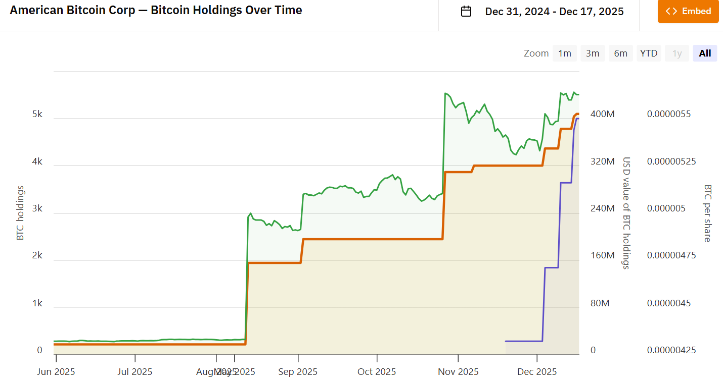American Bitcoin has added more than 1,000 BTC to its reserves since the beginning of December. Its total Bitcoin holdings now stand at 5,098 BTC, valued at approximately $452 million, according to industry data.